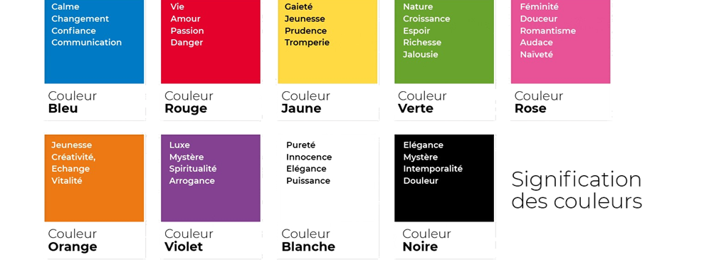 Les couleurs de l’identité visuelle d’une personne ou une marque sont porteuses de valeurs symboliques et de significations qui influencent les choix de votre publics. Les perceptions et les émotions que les couleurs dégagent contribuent à votre image et font partie intégrante de votre stratégie de communication. Il est donc important de connaître la signification des couleurs et leurs représentations afin de mieux utiliser leurs forces pour toucher votre public cible à travers votre charte graphique.