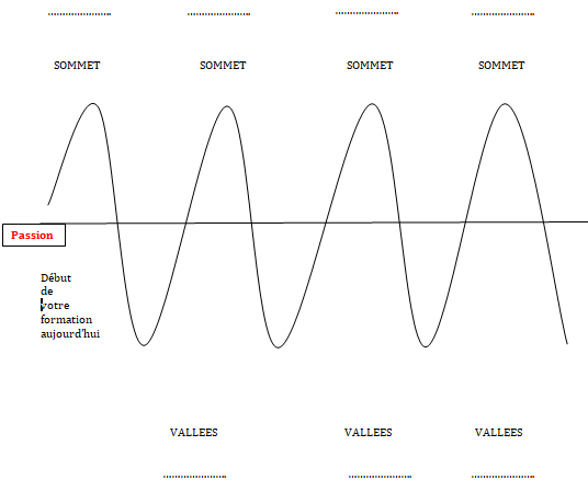 • Les bas, ce sont les vallées. Ce sont les échecs (perçus comme tels ou reconnus par notre environnement professionnel). Ils peuvent être déclenchés par des facteurs internes (perte de sens, démotivation…) ou des facteurs externes (obligation de changement, changement politique ou de dirigeants…) ainsi que les moments de transition où il a fallu réfléchir sur votre orientation professionnelle.