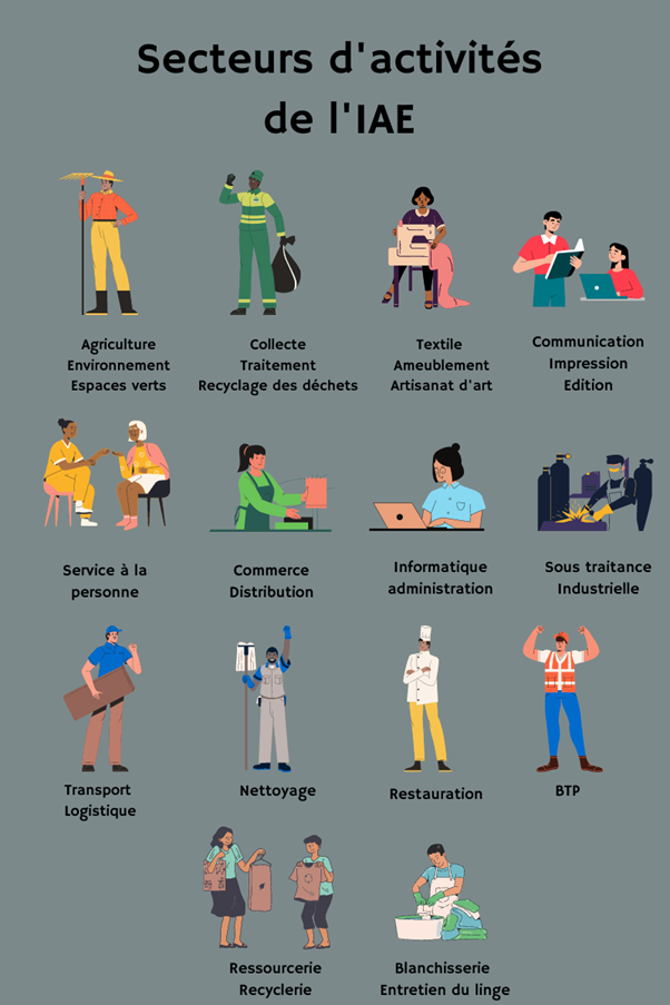 Propreté et environnement urbain (valorisation des déchets, espaces verts), autres secteurs : services à la personne et à la collectivité, installation, maintenance, BTP, industrie, transport, logistique.